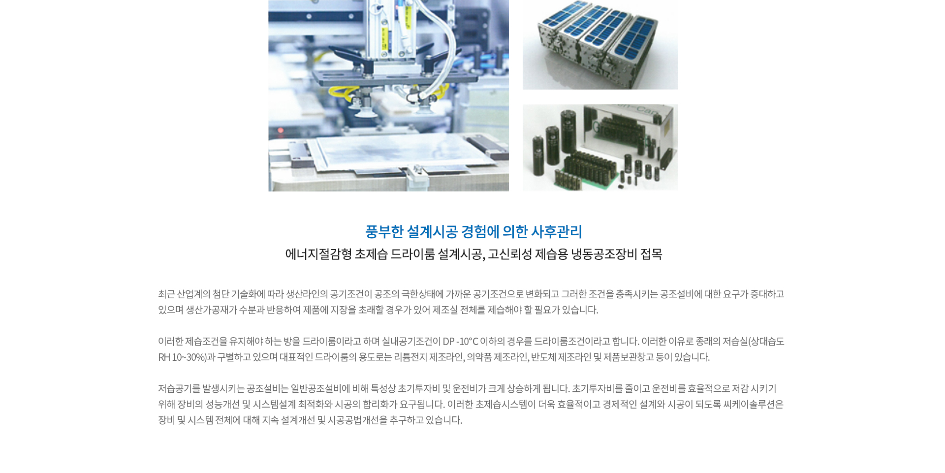 전기전자 제조공정품질향상, 불량율 감소를 위한 저습환경. IC나 LSI 등의 전자제품, 항공우주기기, 로케트, 리튬 배터리 등 정밀공업의 제조공정